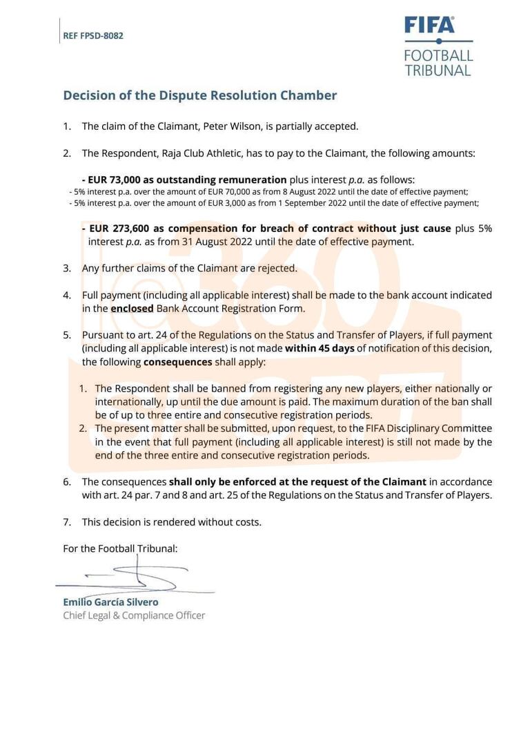 وهددت لجنة النزاعات بـ 'الفيفا" الذي يتوفر موقع le360 سبور على نسخة منه، النادي الأخضر بالحرمان من التعاقد مع أي لاعب لـ 3 فترات، في حال عدم الالتزام بالأداء.