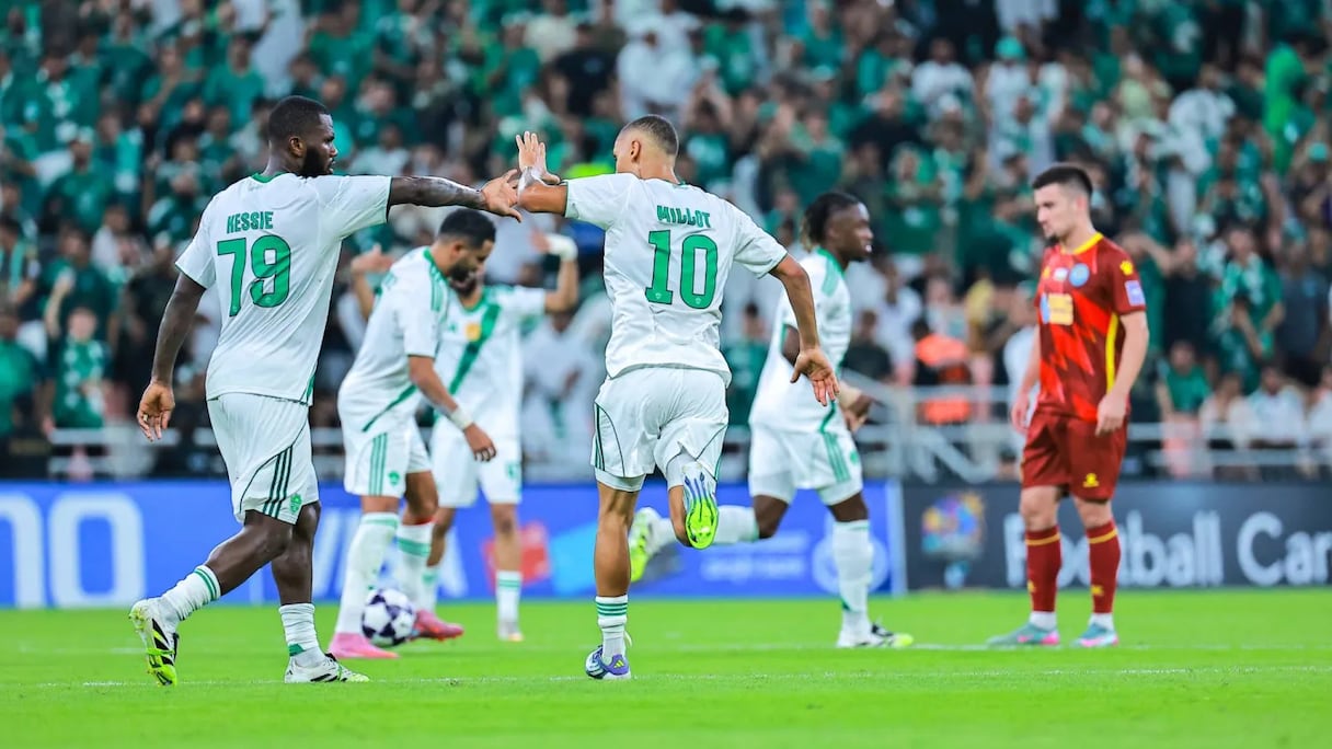 وفي جدّة، بعدما تأخر الأهلي بهدفين سجلهما خسين نورشاييف للضيوف (35 و41)، ردّ أصحاب الأرض بقوة في الشوط الثاني من خلال ثنائية الفرنسي أنزو ميلو (65 و68) قبل أن يقتنص الدولي الجزائري رياض محرز هدف التقدم في الوقت القاتل (90+2). وعاد محمد سليمان ليضيف هدفا رابعا في اللحظات الأخيرة من المباراة (90+15).