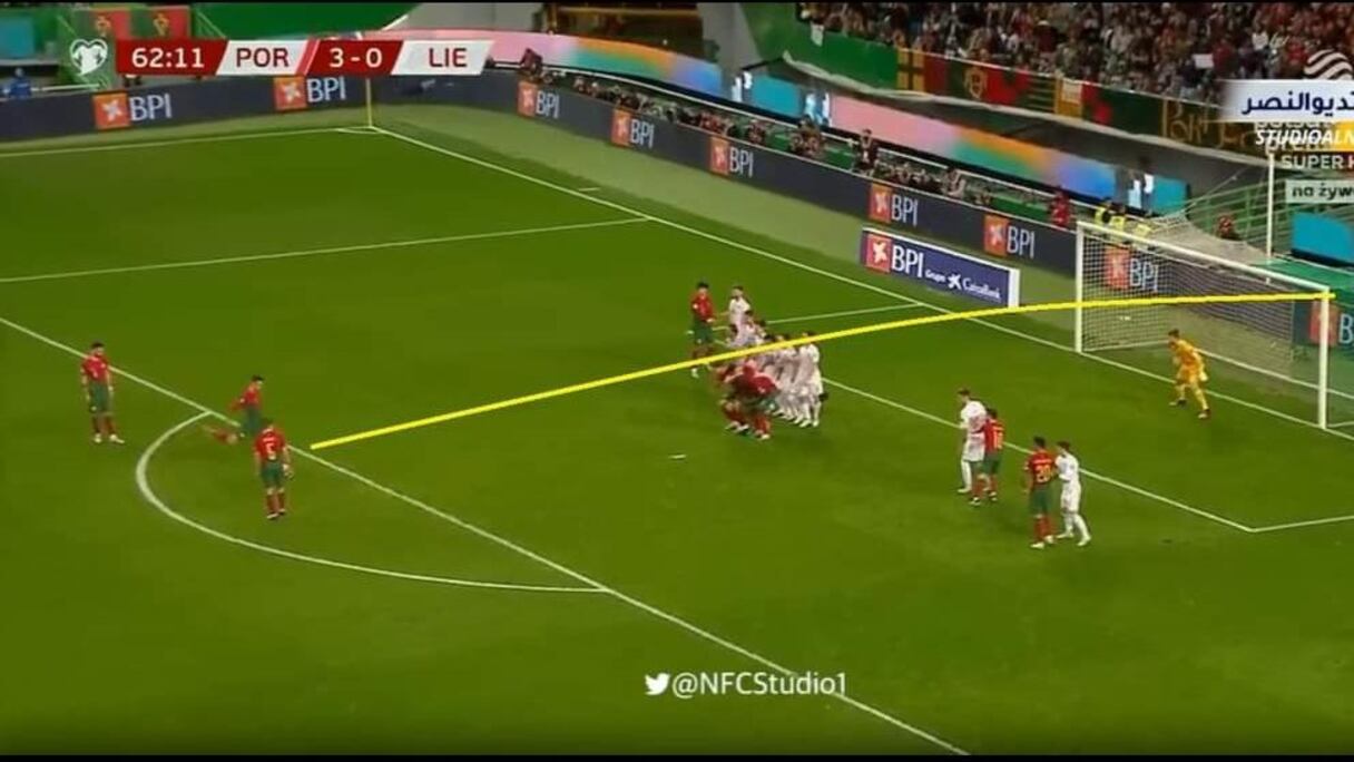 سجل رونالدو ضربة خطأ عالمية في المباراة ضد ليشتنشتاين اليوم الخميس في إطار التصفيات المؤهلة إلى يورو 2024.