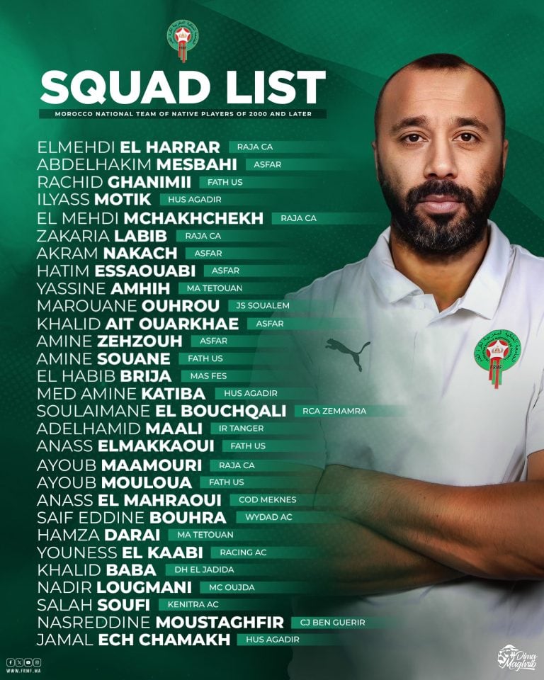 وجه طارق السكتيوي، الدعوة إلى 29 لاعبا للمشاركة في التجمع الإعدادي الذي سيخوضه المنتخب الوطني لمواليد 2000 فما فوق، في الفترة الممتدة ما بين 29 يونيو و و4 يوليوز 2025.