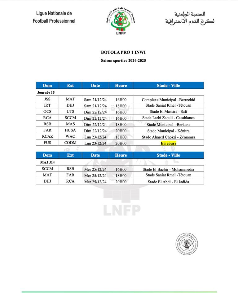 وبخصوص مؤجلات الجولة الـ14 فقد تقرر إجراء مواجهة شباب المحمدية ونهضة بركان يوم الالأربعاء 25 جيسمبر بداية من الرابعة عصرا، فيما يستقبل في اليوم ذاته، المغرب التطواني ضيفه الجيش الملكي تمام الساعة السادسة مساء، ويحل بعدها الرجاء الرياضي ضيفا على الفاع الحسني الجديدي بادية من الثامنة ليلا .