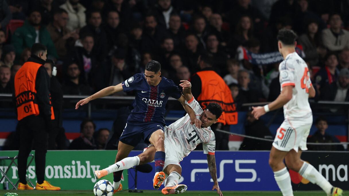 Achraf Hakimi est évacué après une blessure lors du match de la phase de groupes de la Ligue des champions entre le PSG et le FC Bayern Munich, disputé au Parc des Princes, le 4 novembre 2025.. AFP