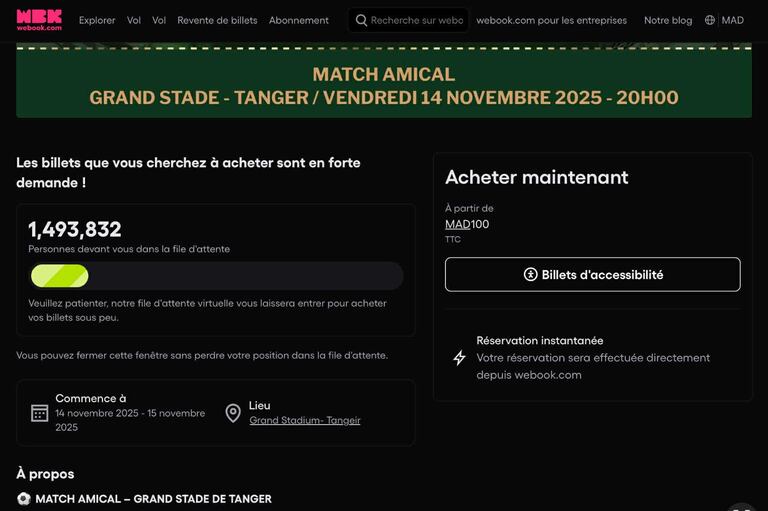وشهدت عملية بيع تذاكر مباراتي المنتخب الوطني المغربي بمدينة طنجة إقبالًا قياسيًا صباح اليوم الجمعة، حيث تجاوز عدد المسجلين في لائحة الانتظار عبر منصة “Webook” والموقع الإلكتروني www.webook.com عند منتصف النهار مليونًا و500 ألف مشجع ينتظرون دورهم لاقتناء التذاكر الخاصة بالمباراة الودية التي ستجمع “الأسود” بمنتخب الموزمبيق يوم 14 نونبر الجاري على أرضية الملعب الكبير بطنجة.