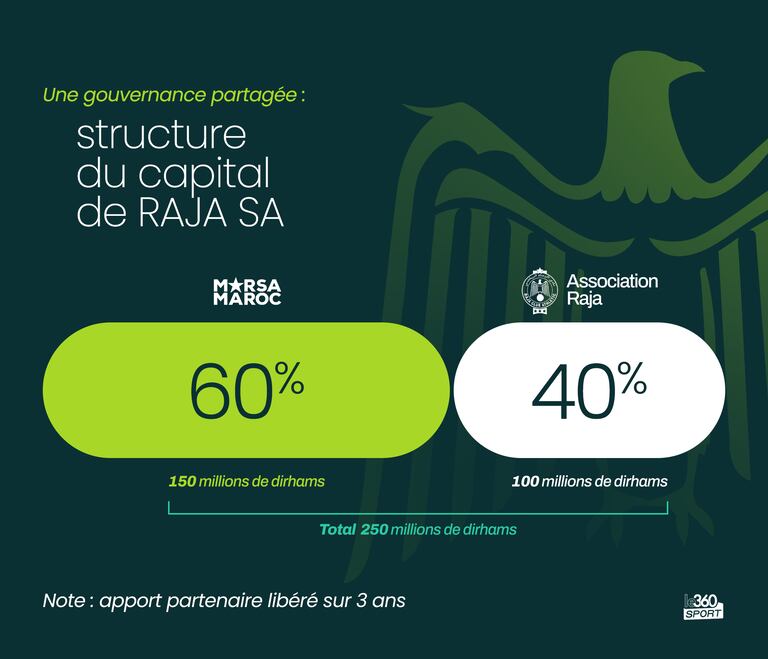 الاستثمار المعلن، 150 مليون درهم على ثلاث مواسم، سيعزز البنية، في حين يشمل مساهمة الجمعية (المقدرة بـ 100 مليون درهم) الحقوق التجارية، وعقود اللاعبين، وأدوات التسيير. إنه منعطف في الحوكمة، يضع الأداء الرياضي والاستقرار المالي في مرتبة واحدة.