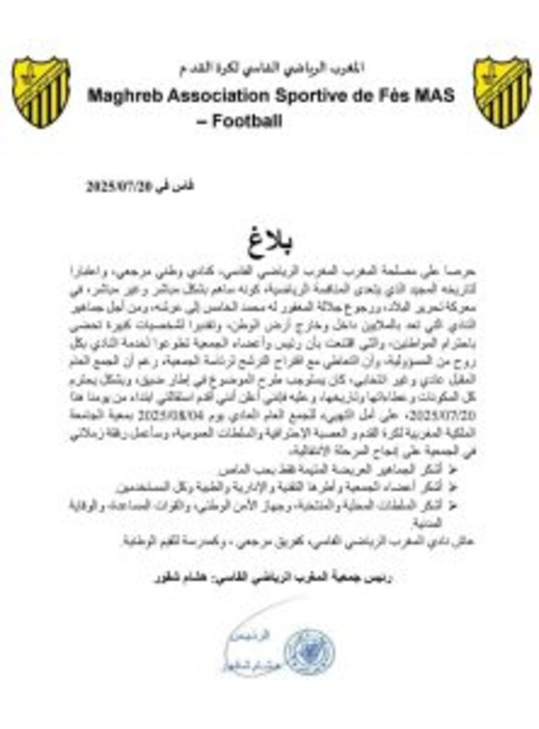 كما وجه شكره لجماهير « الماص » الوفية، ولكل الأطقم التقنية والطبية والإدارية، ولكل من ساهم في خدمة النادي، مؤكدًا أن ارتباطه العاطفي والرمزي بالنادي سيظل قائمًا مهما كانت الظروف.