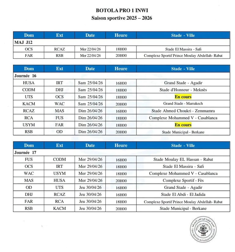 و حددت لجنة البرمجة يوم الأربعاء المقبل موعدا لمباراة أولمبيك اسفي ضد نهضة أتلتيك الزمامرة على الساعة السادسة مساء بملعب المسيرة الخضراء عن مؤجل الدورة 12.