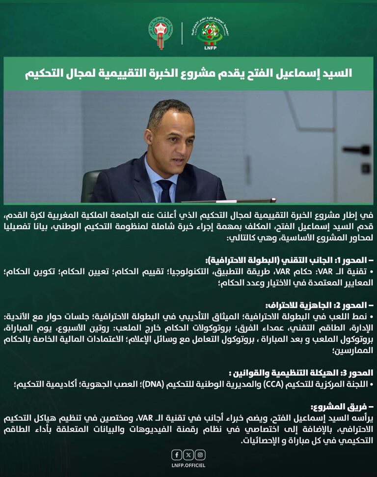 وأعلنت العصبة الوطنية لكرة القدم الاحترافية، أن إسماعيل الفتح قدم مشروع الخبرة التقييمية لمجال التحكيم، الذي يسعى إلى تحسين الأداء التحكيمي عبر ثلاثة محاور رئيسية تشمل الجوانب التقنية، الجاهزية للاحتراف، والهيكلة التنظيمية والقوانين.