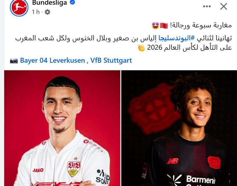 ففي منشور احتفالي على صفحتها الرسمية بموقع « فيسبوك »، عبّرت البوندسليغا عن فخرها بالثنائي المغربي الناشط في البطولة الألمانية، إلياس بن صغير لاعب باير ليفركوزن، وبلال الخنوس لاعب شتوتغارت، بعد مساهمتهما في تأهل « أسود الأطلس » إلى المونديال القادم، والذي سيُقام بكل من الولايات المتحدة وكندا والمكسيك.