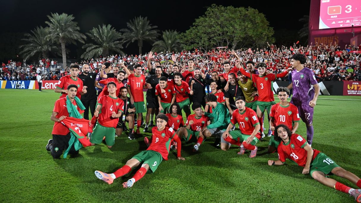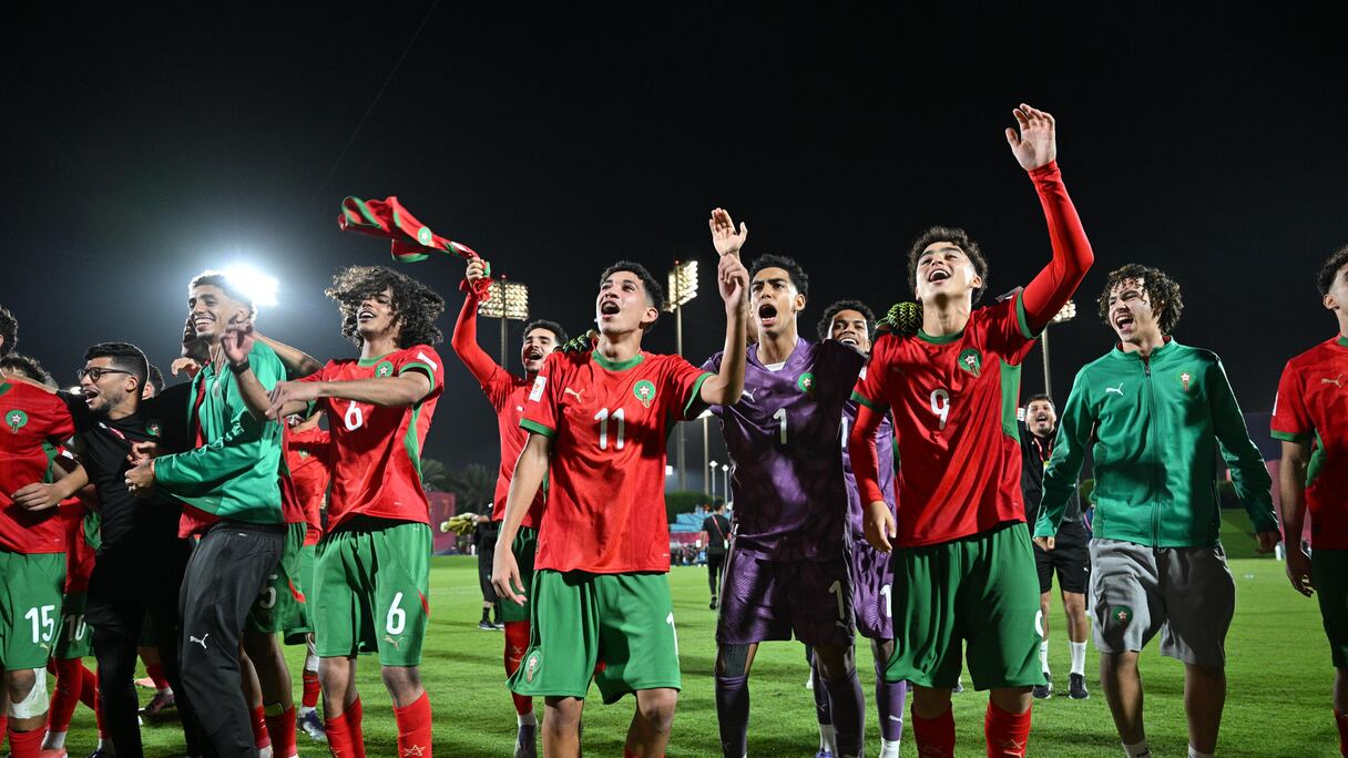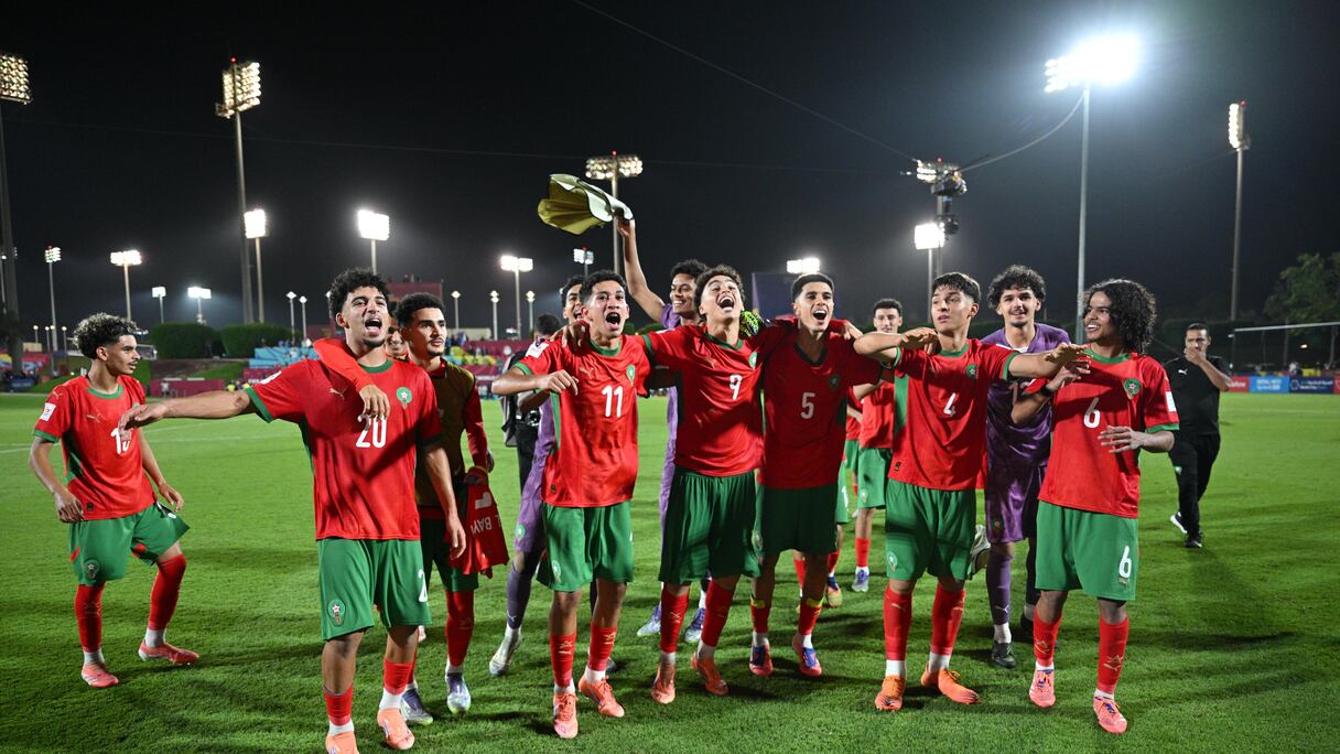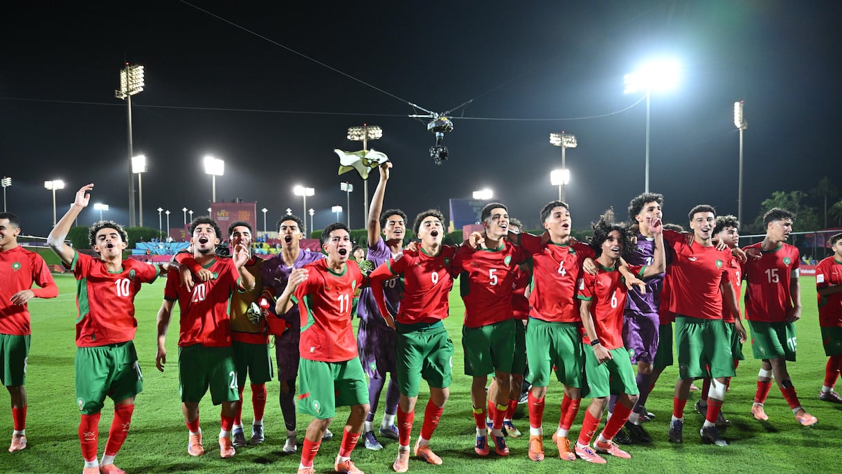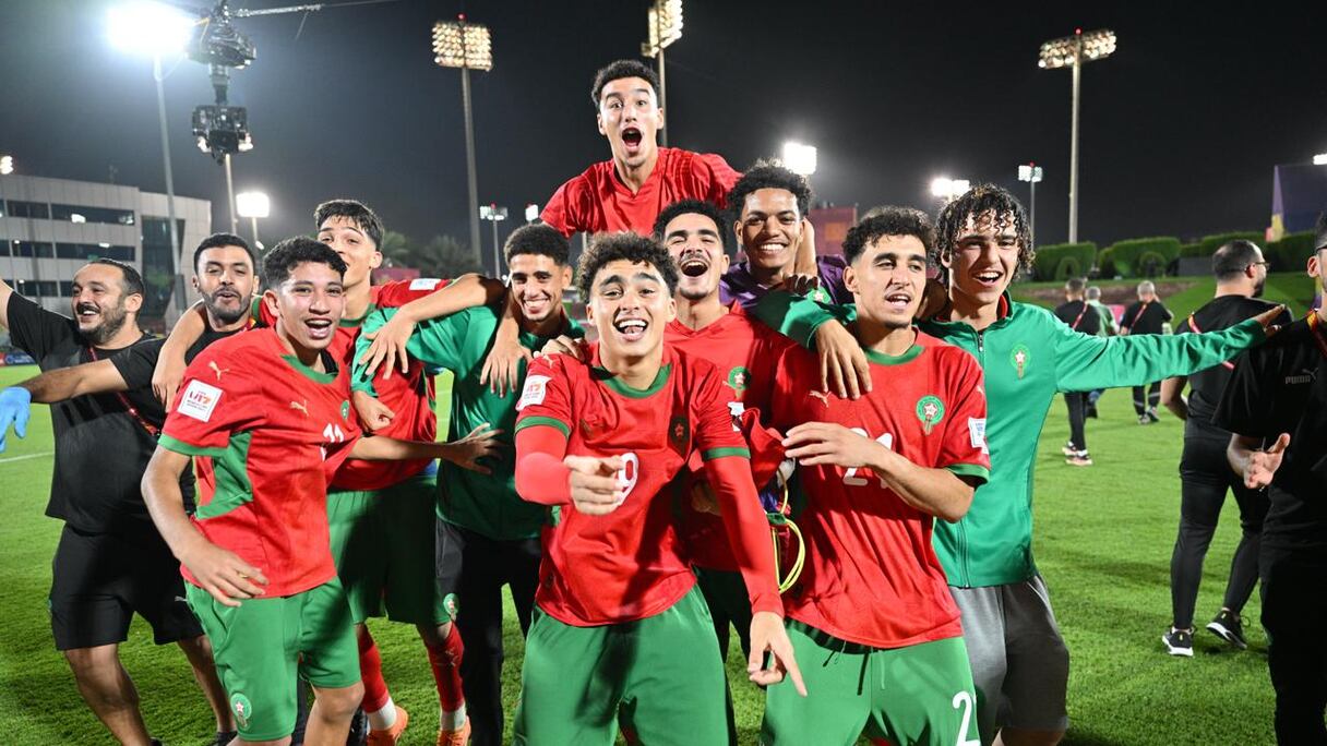 La joie des Lionceaux après Maroc-Mali (U17), 8e de finale de la Coupe du Monde Qatar-2025. FRMF