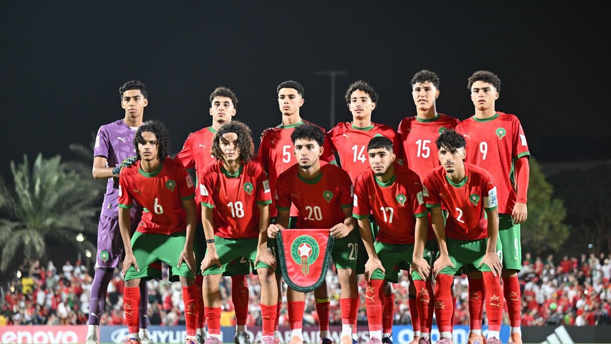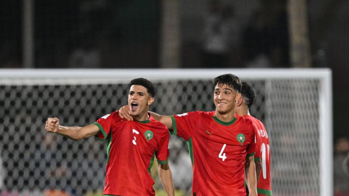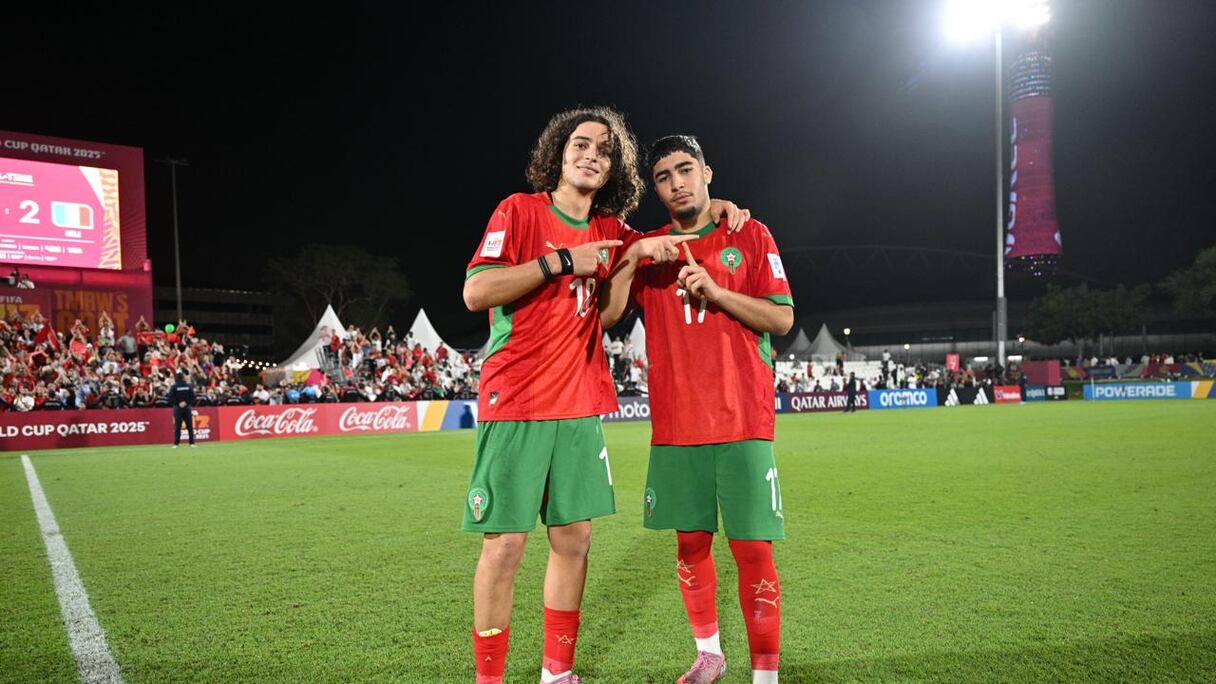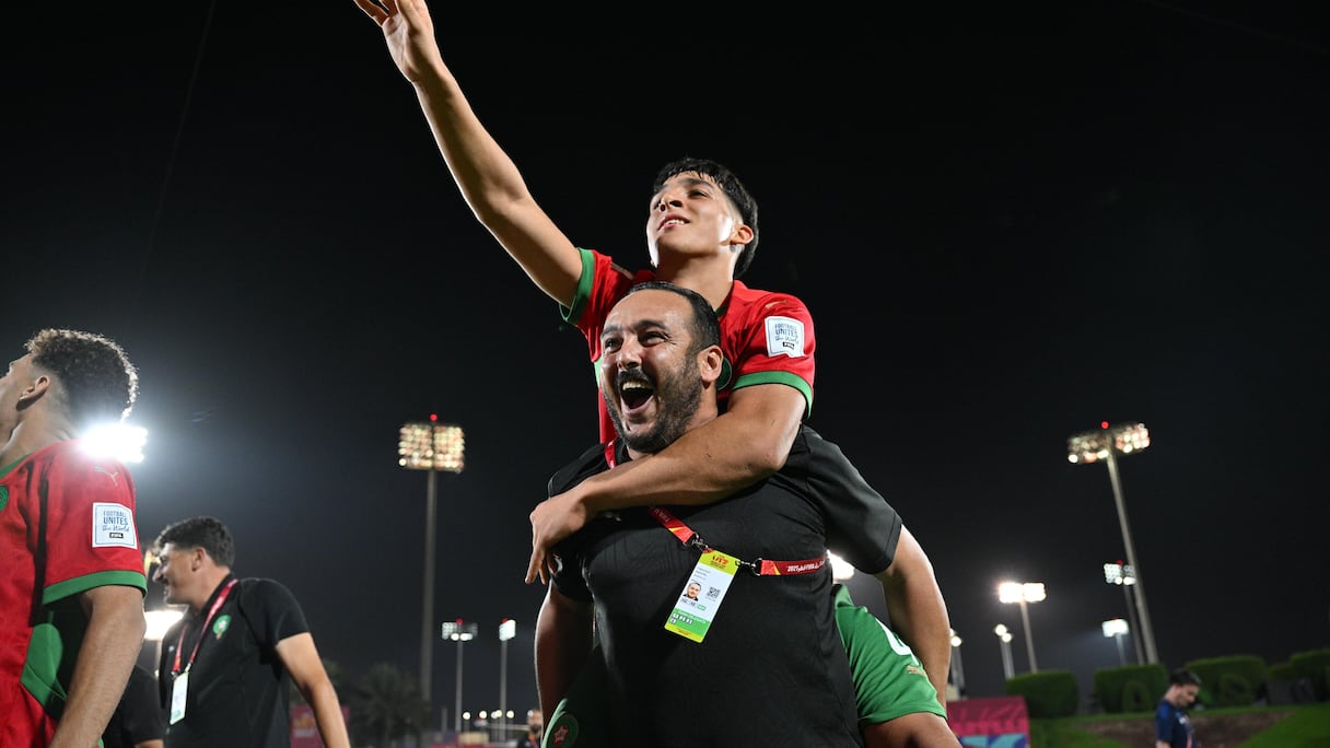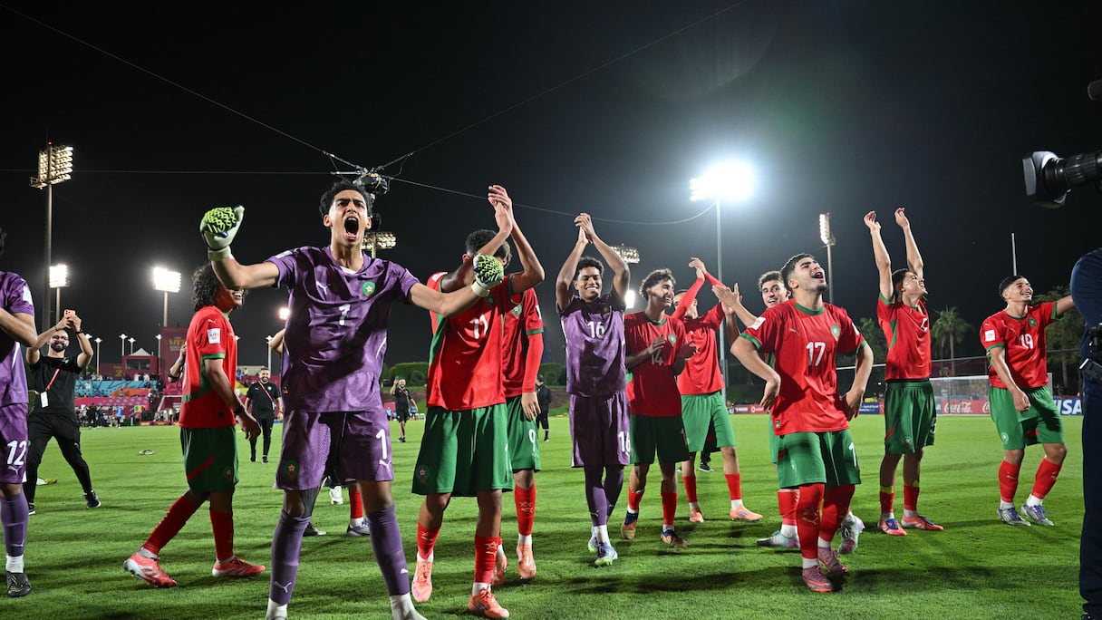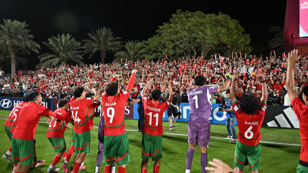 La joie des Lionceaux après Maroc-Mali (U17), 8e de finale de la Coupe du Monde Qatar-2025. FRMF