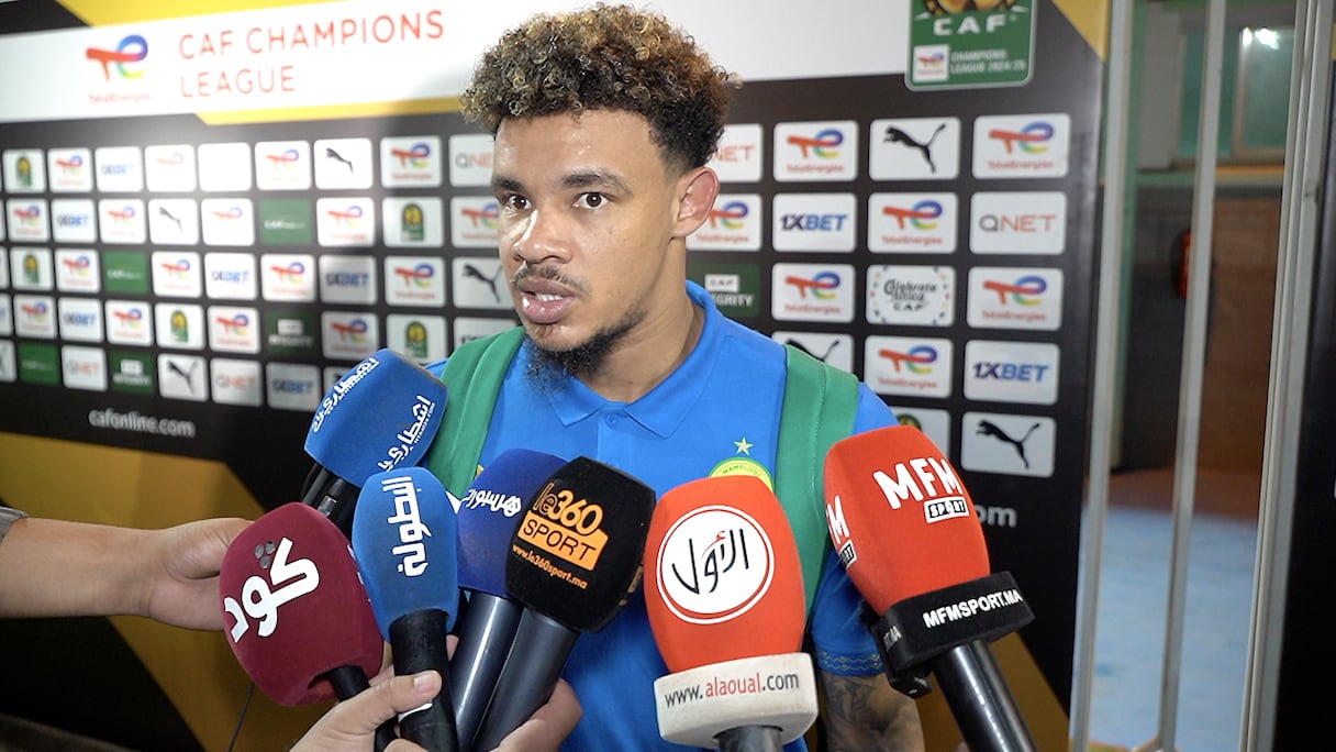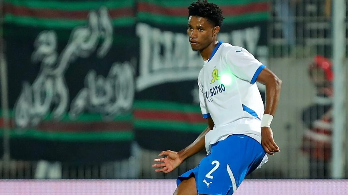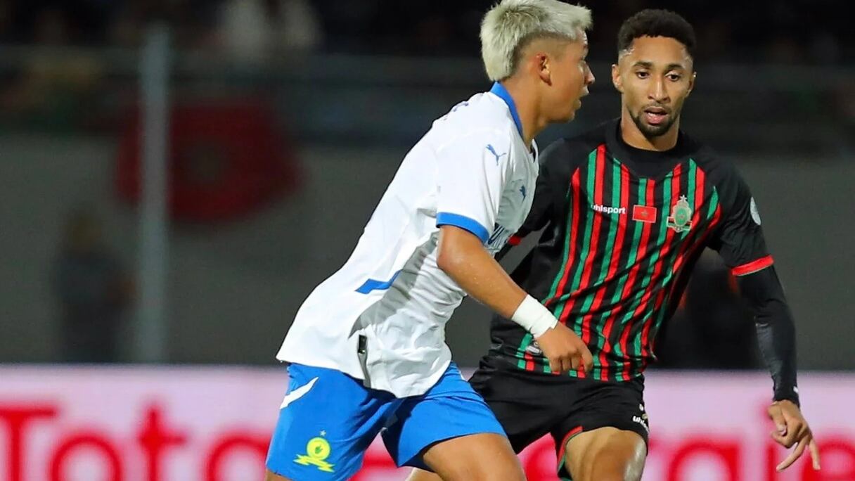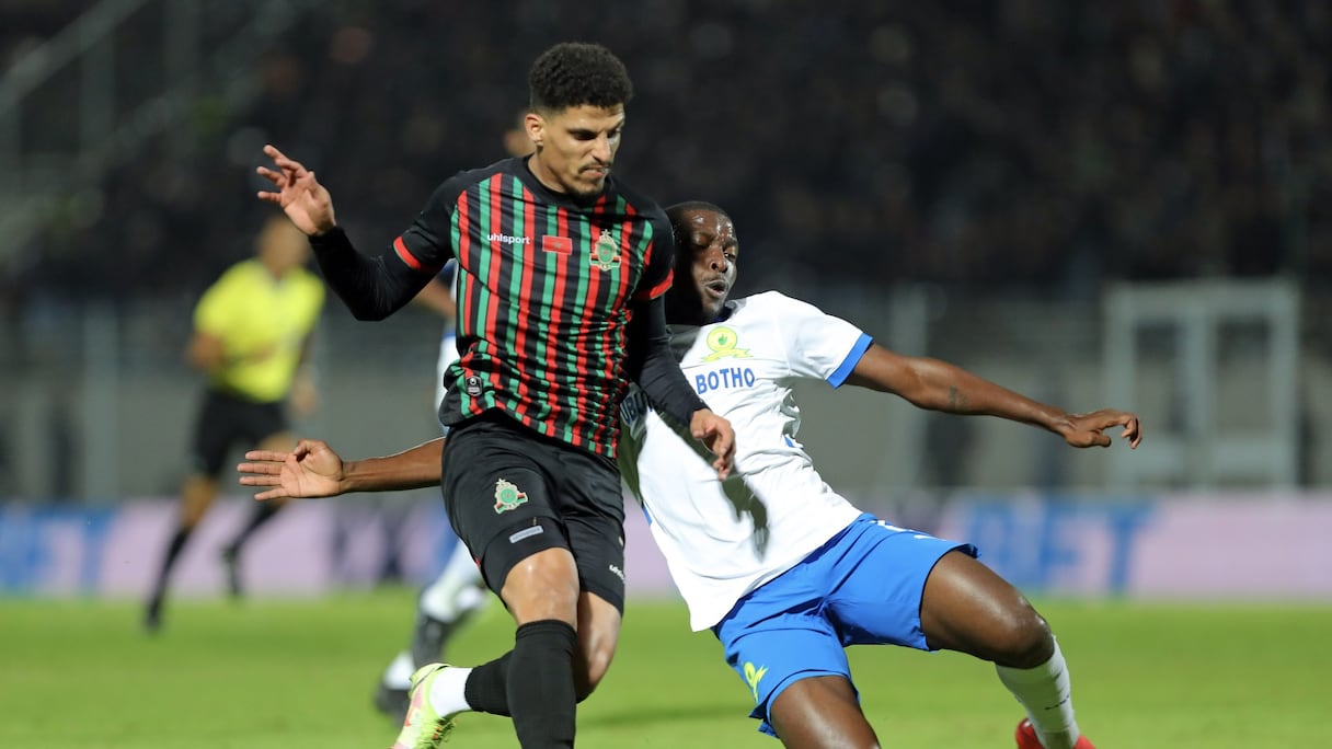 Aubrey Modiba of Mamelodi Sundowns challenges Youssef El Fahli of AS FAR during the CAF Champions League 2024/25 match between AS FAR and Mamelodi Sundowns at Ben M'Hamed El Abdi Stadium in El Jadida, Morocco on 7 December 2024 ©Abderrahmane Damaan/BackpagePix. BackpagePix