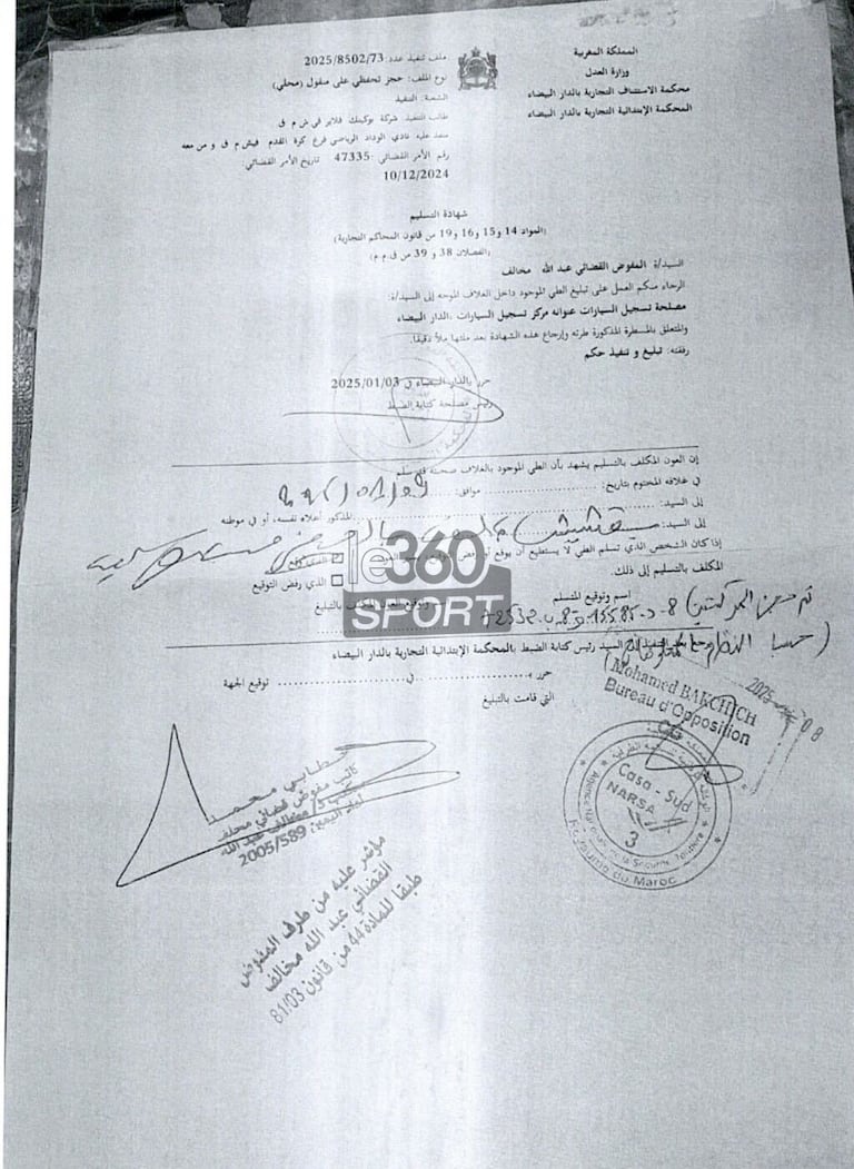 ووفق وثيقة رسمية تحصّل عليها le360 سبور ، فإن محكمة الاستئناف بمدينة الدار البيضاء قضت بالحجز على حافلتي فريق الوداد الرياضي ، بسبب عدم وفاء إدارة النادي الأحمر بأداء المستحقات المذكورة .