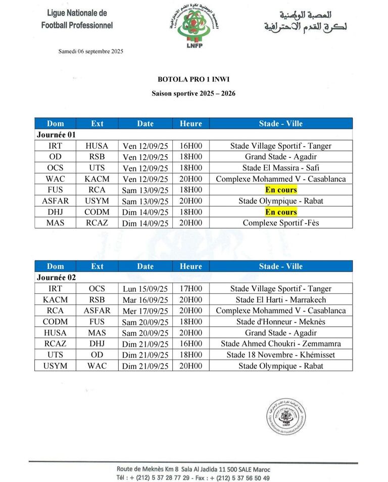 الدفاع الحسني الجديدي – النادي المكناسي يوم الأحد 14 شتنبر على الساعة السادسة (الملعب لم يحدد بعد)