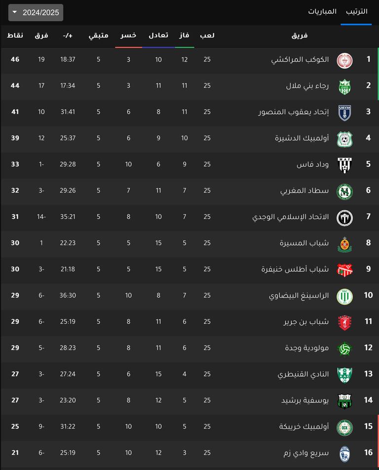 ويبقى فريقي رجاء بني ملال من أكبر المستفيدين من الجولة الـ25 إذ استفاد من خسارة المتصدر الكوكب المراكشي ووصيفه اتحاد يعقوب وانتزع المركز الثاني في سبورة الترتيب عقب فوزه على شباب بن جرير بهدف دون رد، فيما أنعش الفريق السوسي أولمبيك الدشيرة حظوظه في الصعود بعد أن قلص فارق النقاط مع صاحب المركز الثاني لـ4 نقاط قبل 5 جولات من نهاية سباق الدوري .