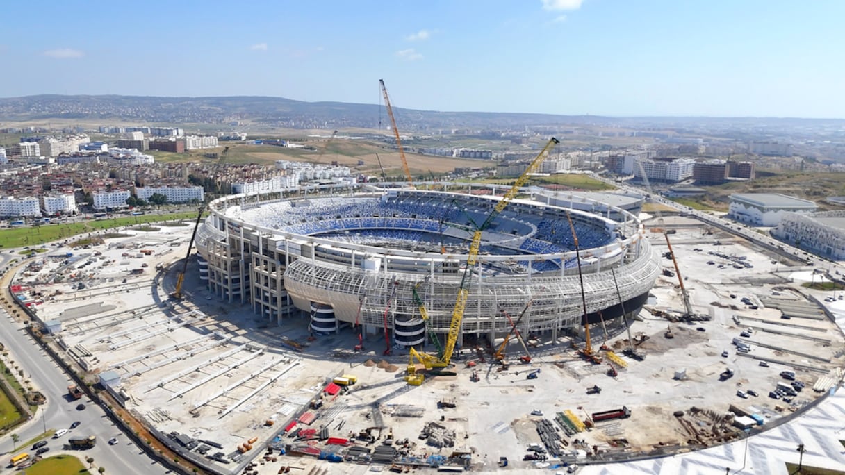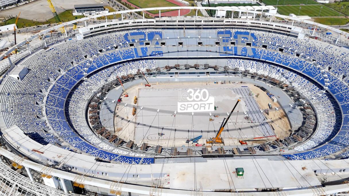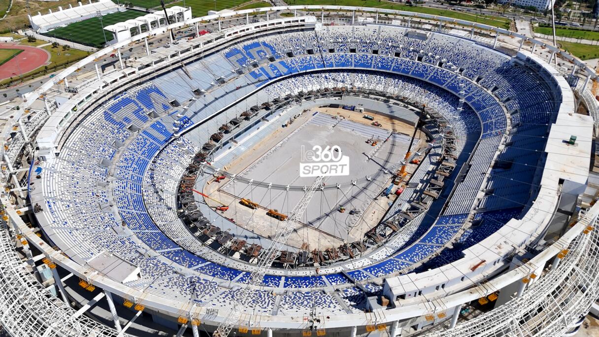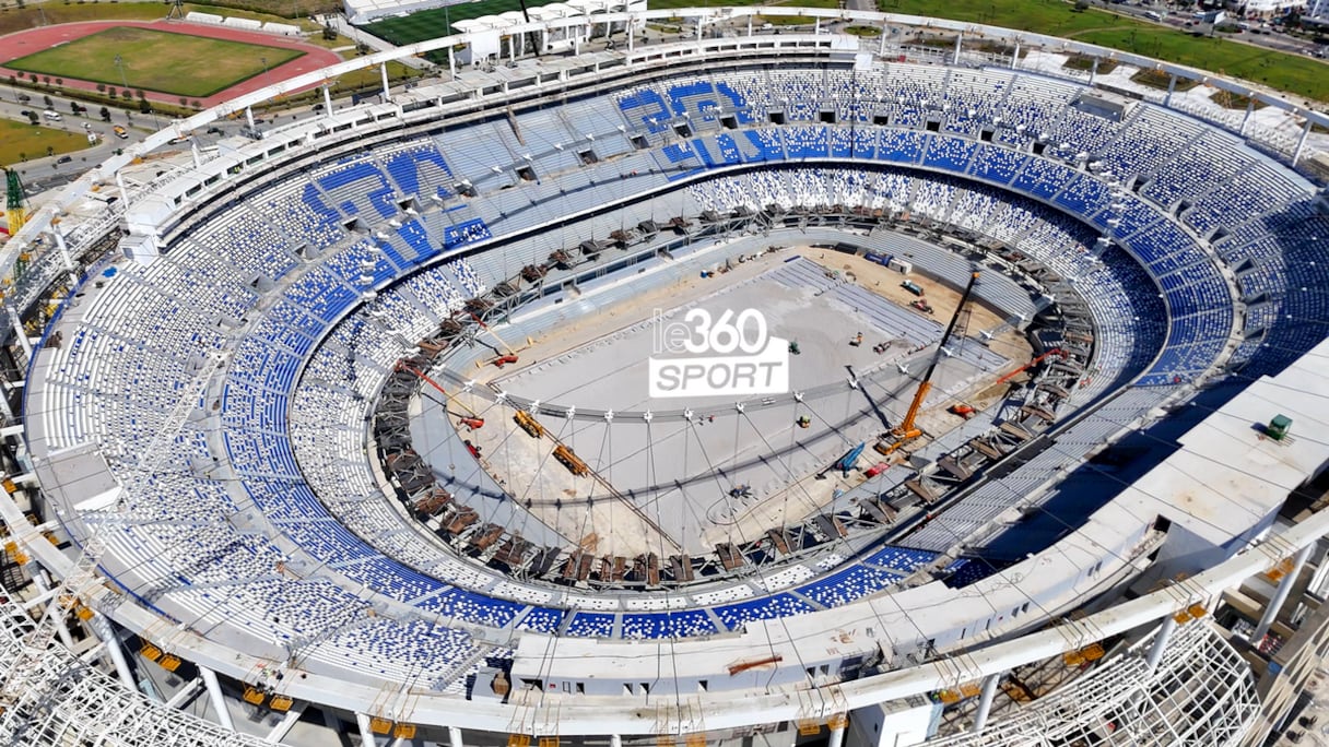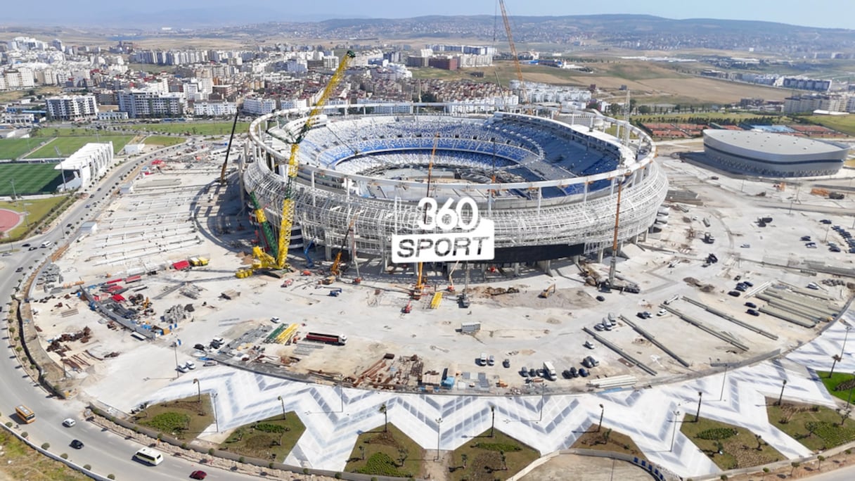 مشاهد جوية لملعب طنجة بعد الانتهاء من تركيب الكراسي والاستعداد لرفع آخر أعمدة السقف العملاقة