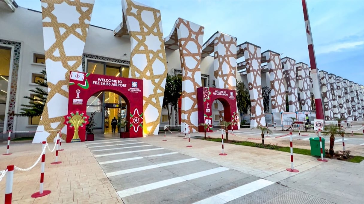 وفق ما رصدته كاميرا le360، فقد جرى تزيين مداخل المطار ببوابات كبرى تحمل عبارة “Welcome to Fez Saiss Airport”، إلى جانب مجسمات لكأس أمم إفريقيا والكرة الرسمية للبطولة، ما يضفي أجواء احتفالية واضحة منذ لحظة وصول المسافرين.