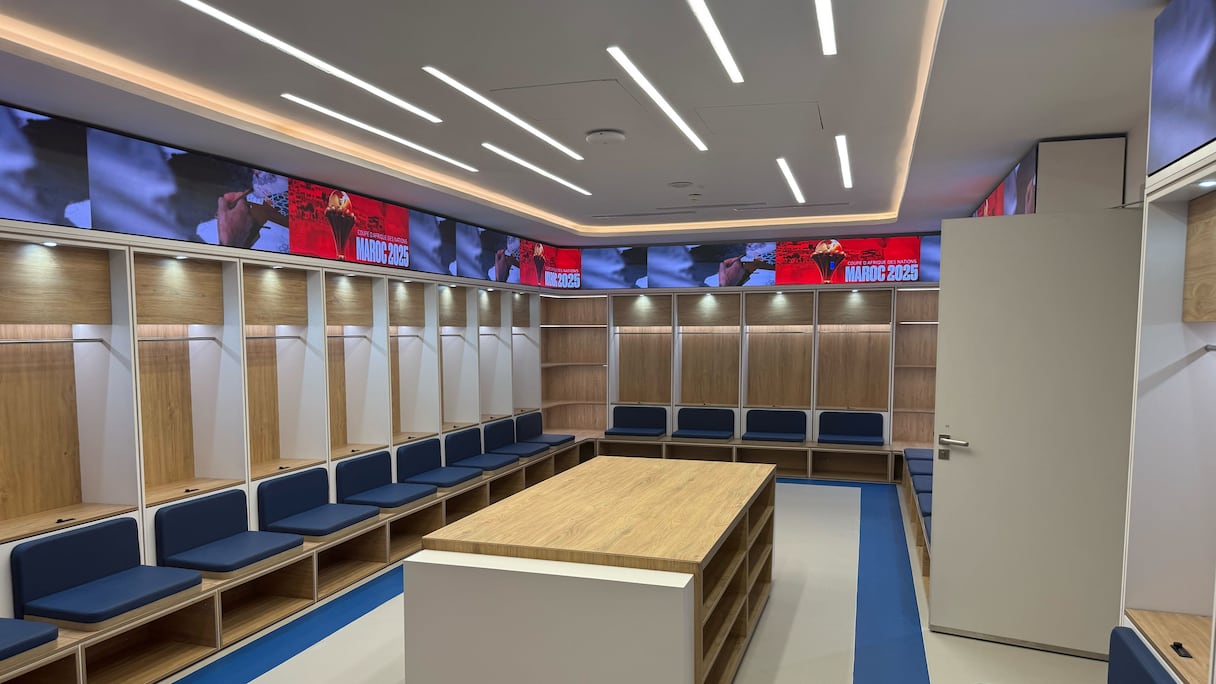 كما يتوفر على مستودعات ملابس حديثة، قاعة للياقة البدنية، قاعة اجتماعات، ووحدة طبية. وقد تجاوزت كلفة الأشغال 600 مليون درهم.