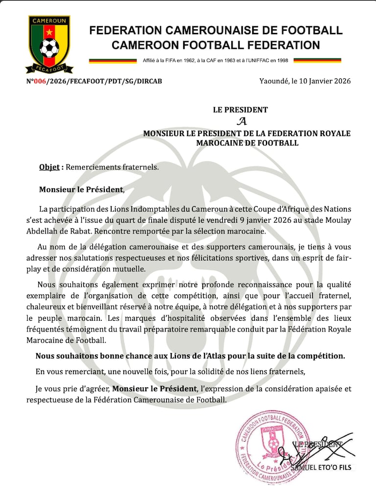 وعبر الاتحاد الكاميروني، من خلال رسالته، عن شكره العميق للجامعة الملكية المغربية لكرة القدم على التنظيم الرائع والمستوى العالي للضيافة الذي حظي به وفد المنتخب الكاميروني في الأراضي المغربية.
