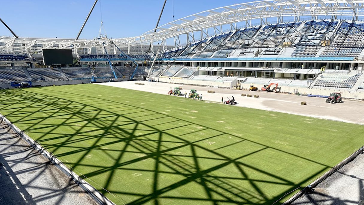 وبالإضافة إلى زرع العشب، تم تجهيز أرضية الملعب بـ48 رشاشًا مائيًا، مع اعتماد نظام ري وصيانة حديث ومتطور، سيمكن من الحفاظ على جمالية العشب وسلامته. ومن المنتظر أن تدخل أرضية الملعب في مرحلة « الهجينة » خلال الأيام القادمة، وهي تقنية تجمع بين العشب الطبيعي والألياف الصناعية، ما يعزز من صلابته ويطيل عمره الافتراضي.