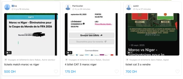 وبلغت تذكرة 100 درهم ما بين 400 و500 درهما، وتذكرة 200 درهم باتت تباع ما بين 700 و800 درهما، فيما أصبحت تذكرة 300 درهم تسوق ما بين 800 إلى 1000 درهما.