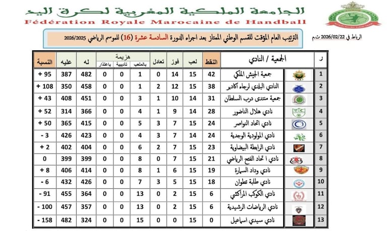وعزز الجيش الملكي صدارته برصيد 42 نقطة، متقدمًا على مطارده المباشر النادي البلدي لرجاء أكادير، في وقت تشتد فيه المنافسة سواء على مراكز المقدمة أو في أسفل الترتيب، مع دخول البطولة مراحلها الحاسمة من الموسم الرياضي الحالي.