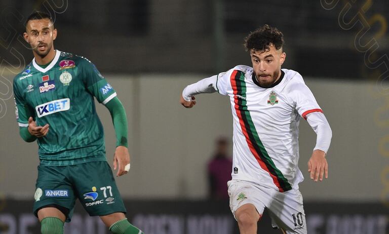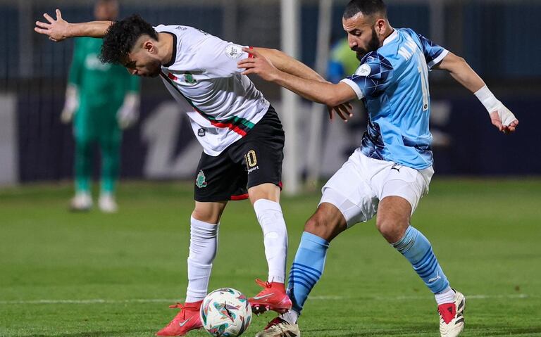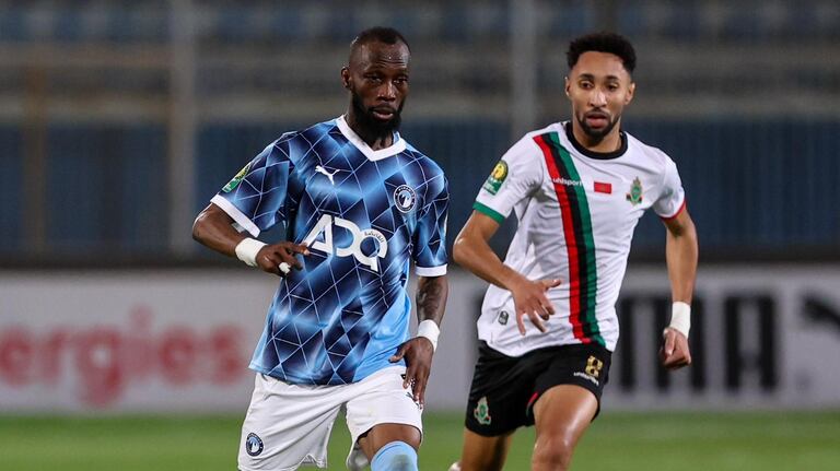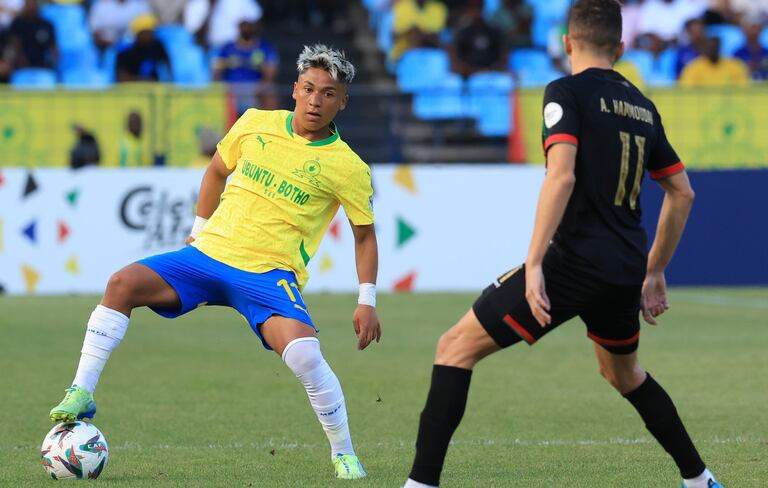 مارسيلو أليندي لاعب ماميلودي صنداونز يتحدى أحمد حمودان لاعب الجيش الملكي خلال مباراة دوري أبطال أفريقيا 2024/25 (BackpagePix)في 03/04/2025 على الساعة 15:48