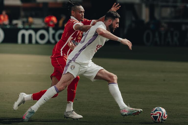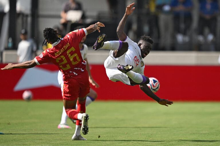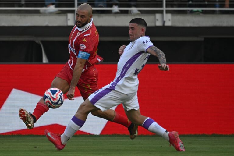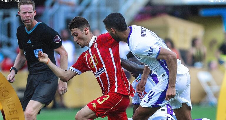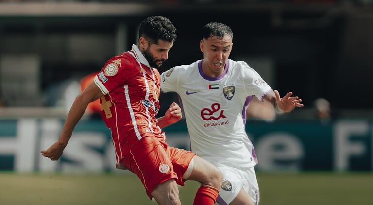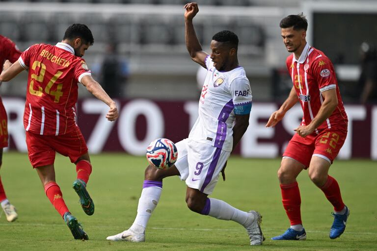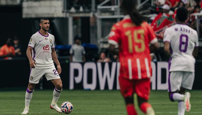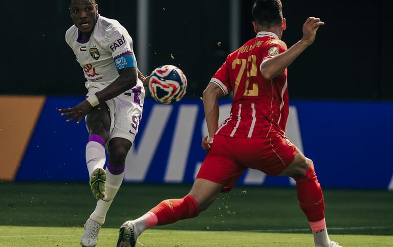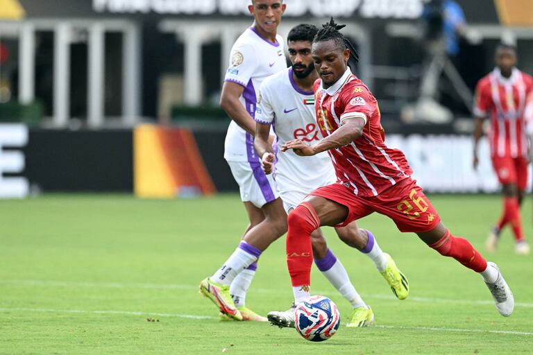 Al Ain's Malian midfielder #70 Abdoul Karim Traore (R) fights for the ball with WAC Casablanca's Tanzanian forward #26 Selemani Mwalimu during the FIFA Club World Cup 2025 Group G football match between Morocco's Wydad AC and UAE's Al Ain FC at the Audi Field stadium in Washington, DC, on June 26, 2025. (Photo by ROBERTO SCHMIDT / AFP)