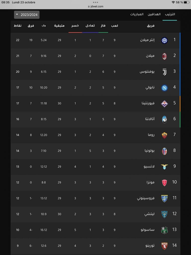 ويأتي ميلان في المركز الثاني برصيد 21 نقطة بفارق نقطة واحدة عن إنتر ميلان المتصدر بعد الجولة التاسعة.