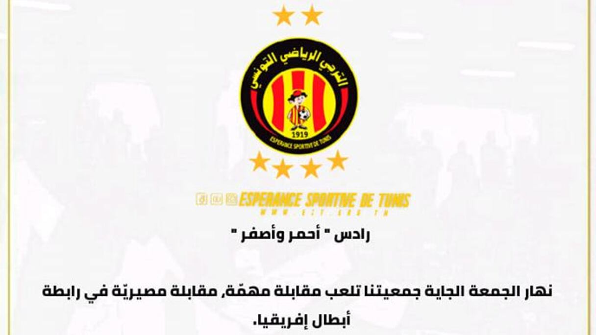 ونشرت الصفحة الرسمية للترجي التونسي صباح اليوم، بلاغ بعنوان ، رادس "أحمر وأصفر" إذ أضافت الصفحة في نفس البلاغ بأن اللون الأسود أو الأبيض أو غيرهما من الألوان لا يجب إرتدائهما في مباراة الجمعة المقبل.