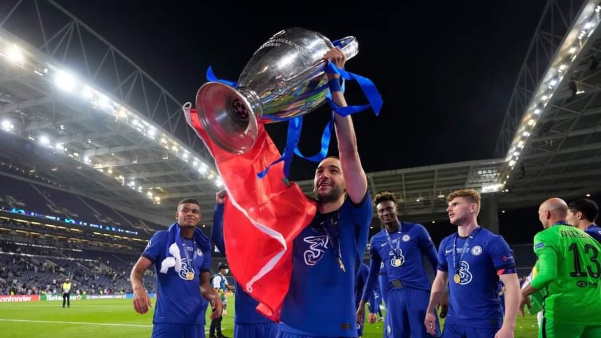 وأثناء احتفاله مع جمهور "البلوز" تغطى زياش نجم المنتخب الوطني، براية المغرب، مباشرة بعد حصوله على الميدالية الذهبية.