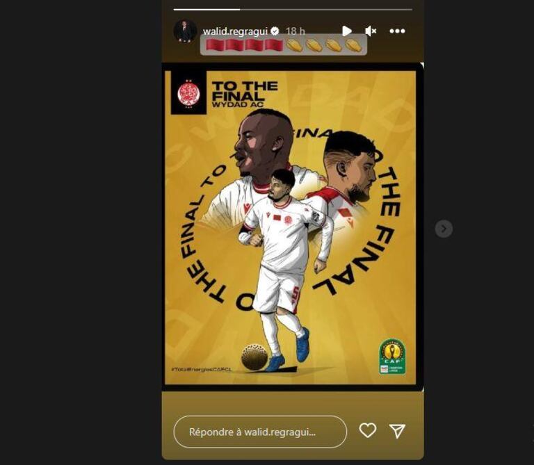 ونشر الناخب الوطني عبر حسابه الرسمية على موقع التواصل الاجتماعي "إنستغرام"، عبر خاصية "السطوري" صورة لتأهل النادي الأحمر، مرفقا بها العلم المغربي.