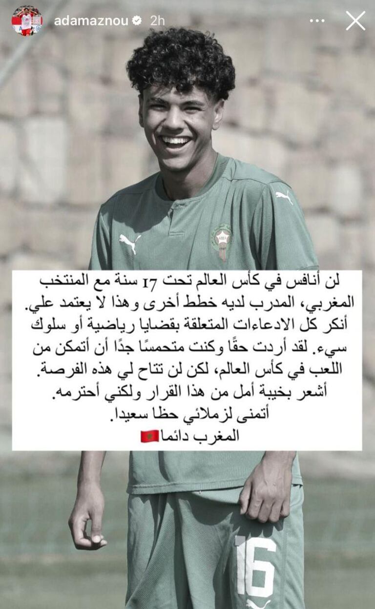 ونشر اللاعب المذكور تدوينة عبر حسابه الشخصي على موقع التواصل الاجتماعي "إنستغرام"، قال خلالها، "لن أنافس في كأس العالم تحت 17 سنة مع المنتخب المغربي، المدرب لديه خطط أخرى وهذا لا يعتمد علي".
